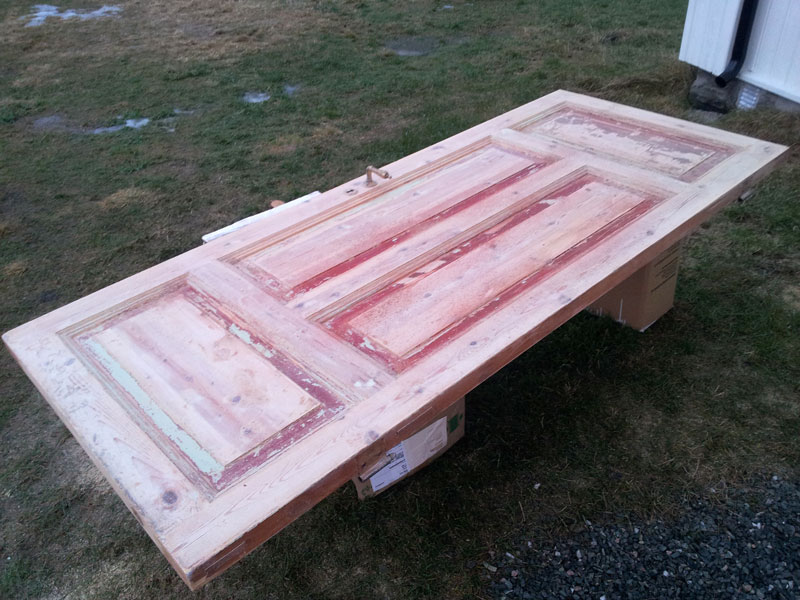 Juleferien var mest bare ferie, og det ble ikke gjort mye "arbeid" i huset. Men jeg ble lei nok av å se den stygge døra mellom kjøkkenet og yttergangen, så i romjula fant jeg fram malingsskrape, pussepapir og hvit grunning. Mot gangen var døra rett og slett snørrgrønn, mens på kjøkkensiden var det en gråblå fin farge. Faktisk så fin at jeg ikke har gjort noe med den siden. Her er bilder før, underveis og etter av døra: